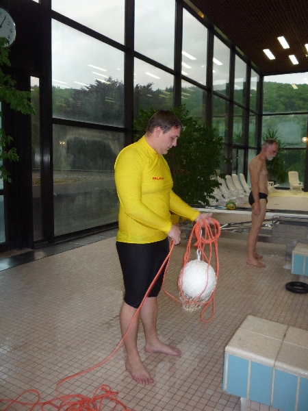 Der Rettungsball besteht aus Styropor und wird von einem Netz umschlossen. Das Netz dient der Grifffestigkeit. Der Rettungsball ist mit einer schwimmfähigen Sicherungsleine verbunden.