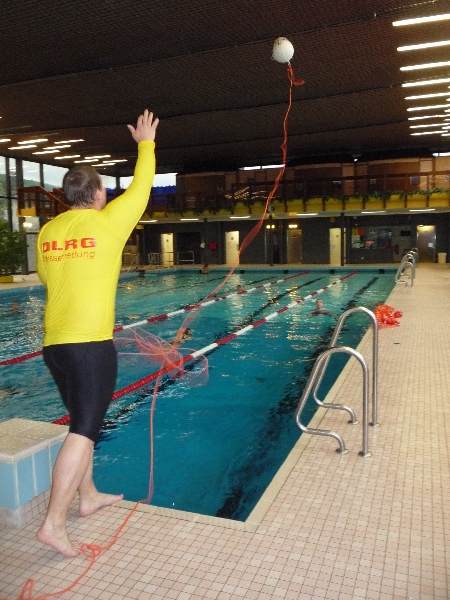 Der Rettungsball wird so geworfen, dass er etwas über den Verunglückten hinausfliegt und durch Ziehen an der Leine zu ihm zurückgezogen werden kann.